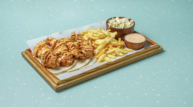Wynwood fried chicken 11.50€ Τραγανά φιλέτα κοτόπουλο στήθος μαριναρισμένα σε 16 καρυκεύματα & επικάλυψη chili mayo sauce & jalapenos. Συνοδεύεται από πατάτες τηγανητές, 3 tortillas, chili mayo sauce & coleslaw