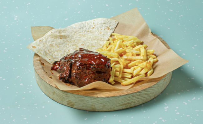 Slow & lo 12.50€ Slow cooked pork γλασαρισμένο με χειροποίητη BBQ sauce. Συνοδεύεται από πατάτες τηγανητές & 3 tortillas