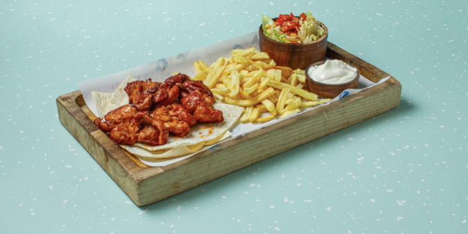 Κοτόπουλο αργοψημένο στη σχάρα με jalapenos & μαριναρισμένο σε BBQ rub. Συνοδεύεται από 3 tortillas, sour cream & ανάμεικτη σαλάτα
