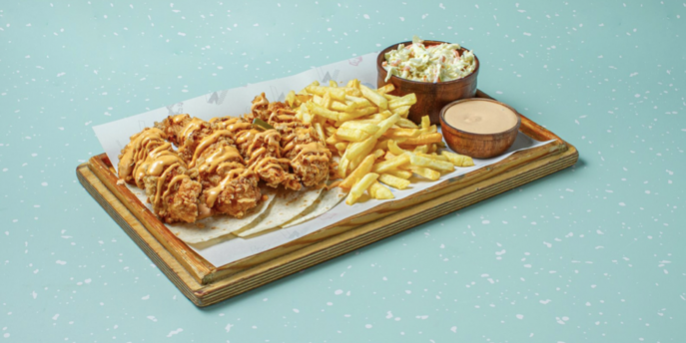 Τραγανά φιλέτα κοτόπουλο στήθος μαριναρισμένα σε 16 καρυκεύματα & επικάλυψη chili mayo sauce & jalapenos. Συνοδεύεται από πατάτες τηγανητές, 3 tortillas, chili mayo sauce & coleslaw